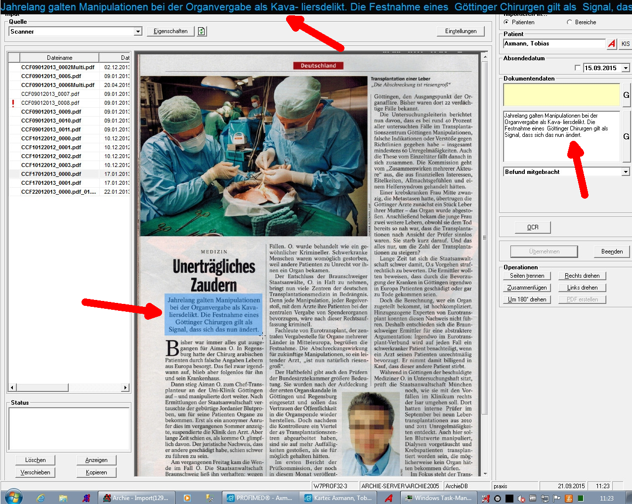 Gescanntes Dokument wird in Archie abgelegt und in dem Praxisprogramm wird ein Eintrag in der Karteikarte generiert. Über diesen Eintrag wird das entsprechende Dokument direkt geöffnet.